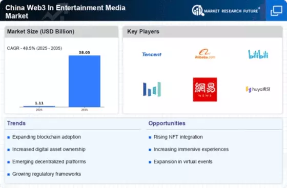 The China Web3 In Entertainment Media Market is currently characterized by a dynamic competitive landscape, driven by rapid technological advancements and increasing consumer demand for immersive digital experiences. Major players such as Tencent (CN), Alibaba (CN), and ByteDance (CN) are at the forefront, each adopting distinct strategies to enhance their market positioning. Tencent (CN) focuses on integrating blockchain technology into its gaming and social media platforms, thereby fostering user engagement and loyalty. Meanwhile, Alibaba (CN) emphasizes partnerships with content creators to expand its digital ecosystem, leveraging its e-commerce strengths to enhance content monetization. ByteDance (CN), on the other hand, appears to be investing heavily in AI-driven content curation, which may significantly influence user interaction and retention across its platforms.