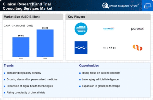 The Clinical Research and Trial Consulting Services Market is currently experiencing a dynamic evolution, driven by the increasing complexity of clinical trials and the growing demand for innovative therapies. As pharmaceutical and biotechnology companies seek to navigate regulatory landscapes and optimize trial designs, the role of consulting services becomes increasingly pivotal. These services not only assist in ensuring compliance with stringent regulations but also enhance the efficiency of trial execution. Furthermore, the integration of advanced technologies, such as artificial intelligence and data analytics, is reshaping the landscape, enabling more precise patient recruitment and improved trial outcomes. This transformation suggests a shift towards more personalized and adaptive trial methodologies, which could potentially lead to faster drug development cycles and reduced costs.