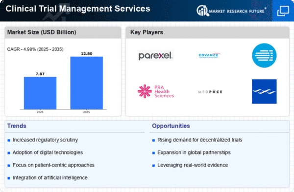 The Clinical Trial Management Services market is characterized by a dynamic competitive landscape, driven by the increasing demand for efficient and effective clinical trials. Key players are focusing on innovation, digital transformation, and strategic partnerships to enhance their service offerings. Companies such as Parexel International (US), Covance (US), and IQVIA (US) are at the forefront, leveraging advanced technologies and data analytics to streamline trial processes and improve patient engagement. Their collective strategies not only enhance operational efficiency but also shape the competitive environment by setting higher standards for service delivery and patient-centric approaches.In terms of business tactics, companies are increasingly localizing their operations to better cater to regional needs, optimizing supply chains to reduce costs, and enhancing their technological capabilities. The market appears moderately fragmented, with a mix of large multinational corporations and smaller specialized firms. This structure allows for a diverse range of services, although the influence of major players like PRA Health Sciences (US) and Medpace (US) is significant, as they continue to expand their global footprint and service capabilities.