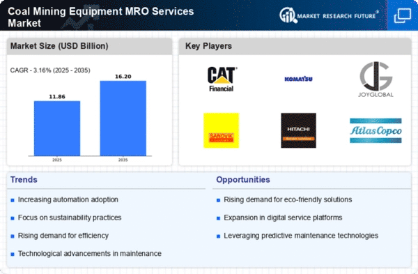 The Coal Mining Equipment MRO Services Market is characterized by a competitive landscape that is increasingly shaped by technological advancements and sustainability initiatives. Key players such as Caterpillar (US), Komatsu (JP), and Sandvik (SE) are actively pursuing strategies that emphasize innovation and operational efficiency. Caterpillar (US) has focused on enhancing its digital offerings, integrating advanced analytics into its equipment maintenance services, which appears to bolster customer engagement and operational uptime. Meanwhile, Komatsu (JP) has been investing in automation technologies, aiming to streamline operations and reduce labor costs, thereby positioning itself as a leader in the digital transformation of mining operations. Sandvik (SE), on the other hand, has been concentrating on sustainable practices, developing equipment that minimizes environmental impact, which resonates well with the growing demand for eco-friendly solutions in the mining sector.The business tactics employed by these companies reflect a concerted effort to localize manufacturing and optimize supply chains, which is crucial in a moderately fragmented market. This competitive structure allows for a diverse range of offerings, yet the influence of major players remains significant. The collective strategies of these companies not only enhance their market presence but also drive innovation across the sector, fostering a competitive environment that encourages continuous improvement and adaptation.