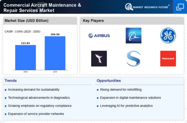 The Commercial Aircraft Maintenance & Repair Services Market is characterized by a dynamic competitive landscape, driven by technological advancements, increasing air traffic, and a growing emphasis on sustainability. Major players such as Airbus (FR), Boeing (US), and Lufthansa Technik (DE) are strategically positioned to leverage these trends. Airbus (FR) focuses on enhancing its digital capabilities, aiming to streamline maintenance processes through predictive analytics and AI. Boeing (US), on the other hand, emphasizes partnerships with local service providers to expand its global footprint, thereby enhancing service accessibility. Lufthansa Technik (DE) is investing in sustainable practices, aligning its operations with environmental regulations while also pursuing innovations in component repair technologies. Collectively, these strategies contribute to a competitive environment that is increasingly centered around technological innovation and sustainability.Key business tactics within the market include localizing manufacturing and optimizing supply chains to enhance operational efficiency. The market structure appears moderately fragmented, with a mix of established players and emerging companies vying for market share. The collective influence of key players is significant, as they set industry standards and drive technological advancements that smaller firms often follow.
