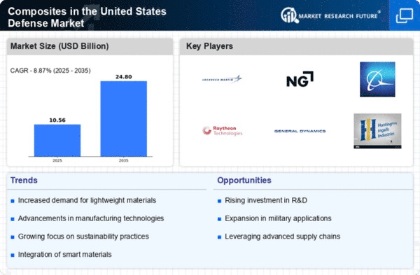 The Composites In United States Defense Market is characterized by a dynamic competitive landscape, driven by technological advancements and increasing demand for lightweight, durable materials. Key players such as Lockheed Martin (US), Northrop Grumman (US), and Boeing (US) are at the forefront, each adopting distinct strategies to enhance their market positioning. Lockheed Martin (US) emphasizes innovation through its investment in advanced composite materials, aiming to improve the performance and efficiency of its defense systems. Northrop Grumman (US) focuses on strategic partnerships and collaborations to bolster its capabilities in composite manufacturing, while Boeing (US) is actively pursuing digital transformation initiatives to streamline its production processes and enhance product quality.