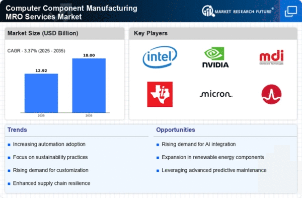 The Computer Component Manufacturing MRO Services Market is characterized by a dynamic competitive landscape, driven by rapid technological advancements and increasing demand for efficient maintenance, repair, and operations solutions. Key players such as Intel Corporation (US), NVIDIA Corporation (US), and Advanced Micro Devices (US) are at the forefront, each adopting distinct strategies to enhance their market positioning. Intel Corporation (US) focuses on innovation through substantial investments in research and development, aiming to lead in semiconductor technology. Meanwhile, NVIDIA Corporation (US) emphasizes partnerships and collaborations, particularly in AI and machine learning applications, which are becoming increasingly vital in MRO services. Advanced Micro Devices (US) is also expanding its footprint through strategic acquisitions, enhancing its capabilities in high-performance computing and graphics solutions, thereby shaping a competitive environment that prioritizes technological prowess and operational efficiency.In terms of business tactics, companies are increasingly localizing manufacturing to mitigate supply chain disruptions and optimize logistics. This trend is particularly evident in the moderately fragmented market structure, where the collective influence of key players is significant. The focus on supply chain optimization is crucial, as it allows companies to respond swiftly to market demands while maintaining cost-effectiveness. The competitive dynamics are further influenced by the need for sustainability, prompting firms to adopt eco-friendly practices in their operations.