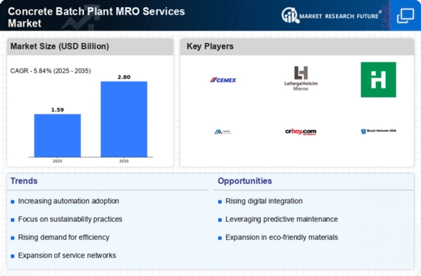 The Concrete Batch Plant MRO Services Market is characterized by a competitive landscape that is increasingly shaped by innovation, sustainability, and digital transformation. Key players such as CEMEX (MX), LafargeHolcim (CH), and HeidelbergCement (DE) are actively pursuing strategies that enhance their operational efficiencies and market reach. CEMEX (MX) has focused on integrating advanced technologies into its operations, which appears to streamline maintenance processes and reduce downtime. Meanwhile, LafargeHolcim (CH) emphasizes sustainability, aiming to reduce its carbon footprint through eco-friendly practices, which resonates well with current market demands for greener solutions. HeidelbergCement (DE) is also investing in digital tools to optimize its supply chain, indicating a collective shift towards leveraging technology to enhance competitive positioning.The business tactics employed by these companies include localizing manufacturing and optimizing supply chains to respond swiftly to market demands. The market structure is moderately fragmented, with several players vying for market share, yet the influence of major companies remains substantial. This dynamic fosters a competitive environment where innovation and operational excellence are paramount, as companies strive to differentiate themselves in a crowded marketplace.