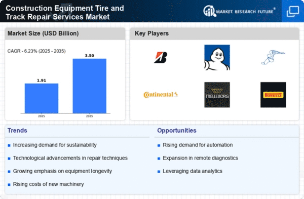 The Construction Equipment Tire and Track Repair Services Market is characterized by a competitive landscape that is increasingly shaped by innovation, sustainability, and strategic partnerships. Key players such as Bridgestone (JP), Michelin (FR), and Goodyear (US) are actively pursuing strategies that emphasize technological advancements and regional expansion. Bridgestone (JP), for instance, has focused on enhancing its service capabilities through digital transformation initiatives, which aim to streamline operations and improve customer engagement. Meanwhile, Michelin (FR) has been investing in sustainable materials and practices, positioning itself as a leader in eco-friendly solutions within the market. Goodyear (US) has also been expanding its footprint through strategic acquisitions, thereby enhancing its service offerings and market reach. Collectively, these strategies contribute to a dynamic competitive environment where innovation and sustainability are paramount.In terms of business tactics, companies are increasingly localizing manufacturing and optimizing supply chains to enhance efficiency and responsiveness to market demands. The market structure appears moderately fragmented, with several key players exerting influence while also allowing for niche providers to thrive. This fragmentation fosters a competitive atmosphere where companies must continuously innovate and adapt to maintain their market positions.