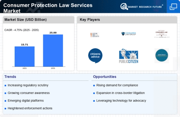The increasing complexity of regulatory frameworks across various jurisdictions appears to drive the Consumer Protection Law Services Market. Governments are enacting stricter regulations to safeguard consumer rights, which necessitates legal expertise. For instance, the implementation of data protection laws and consumer rights directives has led to a heightened demand for legal services that specialize in compliance and litigation. This trend suggests that businesses are increasingly seeking legal counsel to navigate these evolving regulations, thereby expanding the market for consumer protection law services. As companies strive to adhere to these regulations, the need for specialized legal services is likely to grow, indicating a robust future for the Consumer Protection Law Services Market.