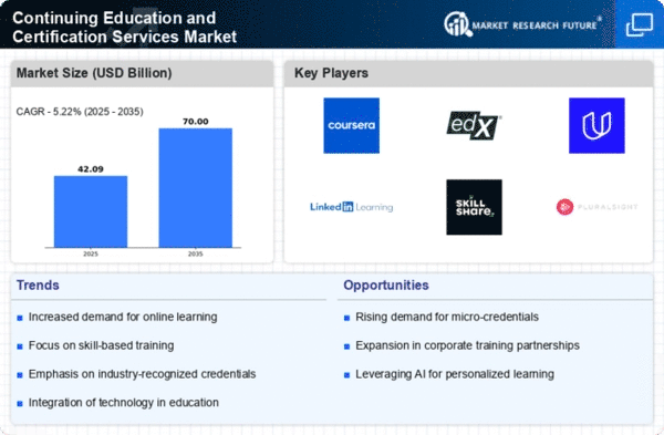 The Middle East and Africa region is gradually developing its Continuing Education and Certification Services Market, with a market size of 2.0 in 2024. The growth is driven by increasing awareness of the importance of education and skill development, alongside government initiatives aimed at enhancing educational access. Regulatory support for online learning platforms is also emerging, creating new opportunities for growth in this sector.