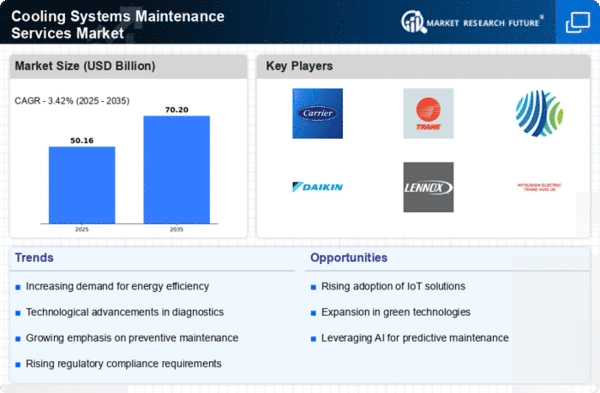 The Cooling Systems Maintenance Services Market is characterized by a competitive landscape that is increasingly shaped by innovation, sustainability, and digital transformation. Key players such as Carrier (US), Trane (US), and Daikin (JP) are actively pursuing strategies that enhance their market positioning. Carrier (US) has focused on integrating advanced technologies into its service offerings, which not only improves efficiency but also aligns with the growing demand for environmentally friendly solutions. Meanwhile, Trane (US) emphasizes its commitment to sustainability through energy-efficient products and services, which resonates with a market that is progressively prioritizing eco-friendly practices. Daikin (JP), on the other hand, is leveraging its global presence to expand its service capabilities, thereby enhancing customer engagement and operational efficiency. Collectively, these strategies indicate a shift towards a more integrated and sustainable approach within the market, fostering a competitive environment that rewards innovation and customer-centric solutions.In terms of business tactics, companies are increasingly localizing manufacturing and optimizing supply chains to enhance responsiveness to market demands. The competitive structure of the Cooling Systems Maintenance Services Market appears moderately fragmented, with several key players exerting influence over various segments. This fragmentation allows for a diverse range of service offerings, yet the collective impact of major companies like Johnson Controls (US) and Lennox (US) is significant, as they drive trends that smaller players often follow.