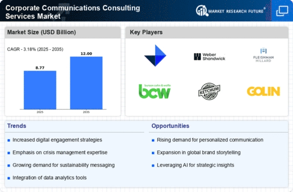 The Corporate Communications Consulting Services Market is characterized by a dynamic competitive landscape, driven by the increasing demand for strategic communication solutions in a rapidly evolving global environment. Key players such as Edelman (US), Weber Shandwick (US), and FleishmanHillard (US) are at the forefront, each adopting distinct strategies to enhance their market positioning. For instance, Edelman (US) emphasizes innovation in digital communication, leveraging data analytics to tailor client strategies effectively. Meanwhile, Weber Shandwick (US) focuses on regional expansion, particularly in emerging markets, to capture new client segments. FleishmanHillard (US) appears to prioritize partnerships with technology firms, integrating advanced tools into their service offerings, which collectively shapes a competitive environment that is increasingly reliant on technological advancement and strategic collaboration.The market's competitive structure is moderately fragmented, with numerous players vying for market share. Key business tactics include localizing services to meet regional needs and optimizing supply chains to enhance service delivery. The collective influence of these major players fosters a competitive atmosphere where agility and responsiveness to client needs are paramount. As firms adapt to the changing landscape, the ability to innovate and form strategic alliances becomes crucial for maintaining a competitive edge.