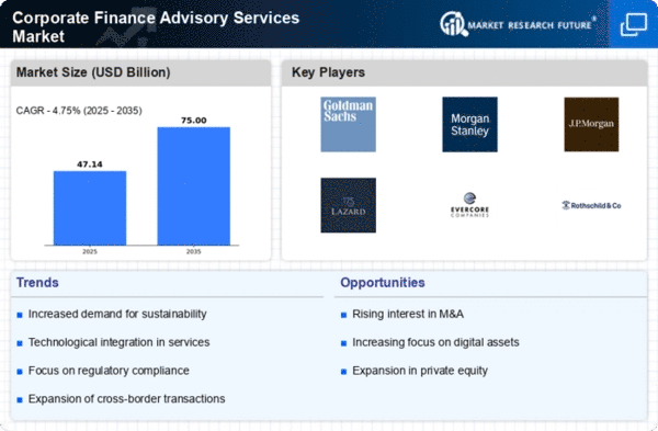 The Corporate Finance Advisory Services Market is characterized by a dynamic competitive landscape, driven by factors such as increasing globalization, the need for strategic financial guidance, and the growing complexity of financial transactions. Major players like Goldman Sachs (US), J.P. Morgan (US), and Lazard (US) are at the forefront, each adopting distinct strategies to enhance their market positioning. Goldman Sachs (US) emphasizes innovation through technology-driven solutions, while J.P. Morgan (US) focuses on expanding its global footprint and enhancing client relationships. Lazard (US), on the other hand, leverages its deep industry expertise to provide tailored advisory services, thereby shaping a competitive environment that is both collaborative and competitive.The market structure appears moderately fragmented, with a mix of large multinational firms and specialized boutique advisory firms. Key players employ various business tactics, such as localizing services to meet regional demands and optimizing their operational frameworks to enhance efficiency. This collective influence of major firms fosters a competitive atmosphere where agility and responsiveness to market changes are paramount.