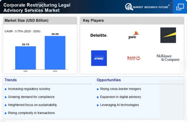 The Corporate Restructuring Legal Advisory Services Market is characterized by a dynamic competitive landscape, driven by the increasing complexity of global business operations and the need for strategic realignment. Key players such as Deloitte (GB), PwC (GB), and Alvarez & Marsal (US) are actively shaping the market through their innovative approaches and strategic initiatives. Deloitte (GB) has positioned itself as a leader in digital transformation, focusing on integrating advanced analytics into its advisory services. Meanwhile, PwC (GB) emphasizes a holistic approach to restructuring, combining legal, financial, and operational expertise to deliver comprehensive solutions. Alvarez & Marsal (US) has carved a niche in turnaround management, leveraging its deep industry knowledge to assist distressed companies in navigating complex restructuring processes. Collectively, these strategies contribute to a competitive environment that is increasingly focused on delivering value through innovation and tailored solutions.The market structure appears moderately fragmented, with a mix of large multinational firms and specialized boutique advisory services. Key players employ various business tactics, such as localizing their service offerings to meet regional demands and optimizing their operational frameworks to enhance efficiency. This competitive structure allows for a diverse range of services, catering to the unique needs of clients across different sectors. The influence of major firms is significant, as they set benchmarks for service quality and innovation, thereby shaping client expectations and industry standards.