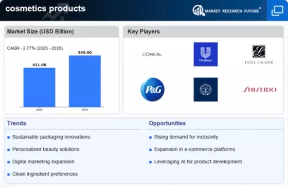 The cosmetics products market is currently characterized by a dynamic competitive landscape, driven by innovation, sustainability, and digital transformation. Major players such as L'Oreal (FR), Unilever (GB), and Estée Lauder (US) are at the forefront, each adopting distinct strategies to enhance their market positioning. L'Oreal (FR) emphasizes innovation through its investment in research and development, focusing on personalized beauty solutions. Unilever (GB) is increasingly prioritizing sustainability, aiming to reduce its environmental footprint while expanding its product lines. Estée Lauder (US) leverages digital channels to enhance customer engagement, reflecting a broader trend towards e-commerce and direct-to-consumer sales. Collectively, these strategies contribute to a competitive environment that is both fragmented and concentrated, with key players vying for market share through differentiated offerings.In terms of business tactics, companies are localizing manufacturing and optimizing supply chains to enhance efficiency and responsiveness to market demands. The market structure appears moderately fragmented, with a mix of established brands and emerging players. This fragmentation allows for diverse consumer preferences to be met, while the influence of key players remains substantial, shaping trends and setting benchmarks for quality and innovation.