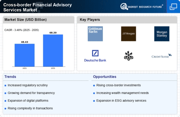 The Cross-border Financial Advisory Services Market is characterized by a dynamic competitive landscape, driven by globalization, regulatory changes, and the increasing complexity of financial transactions. Major players such as Goldman Sachs (US), J.P. Morgan (US), and Deutsche Bank (DE) are strategically positioned to leverage their extensive networks and expertise in navigating cross-border regulations. These firms focus on innovation and digital transformation, enhancing their service offerings to meet the evolving needs of multinational clients. Their collective strategies not only shape the competitive environment but also set benchmarks for service quality and operational efficiency.Key business tactics within this market include localizing services to cater to regional nuances and optimizing supply chains to enhance responsiveness. The competitive structure appears moderately fragmented, with a mix of large multinational firms and specialized boutique advisory services. The influence of key players is substantial, as they often dictate market trends and set standards for compliance and advisory practices.