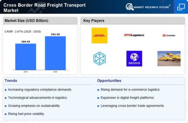 As of December current competitive trends in the Cross Border Road Freight Transport Market include a pronounced focus on digitalization, sustainability, and the integration of artificial intelligence (AI) into logistics operations. Strategic alliances are increasingly shaping the landscape, as companies collaborate to enhance service offerings and operational efficiencies. Looking ahead, competitive differentiation is expected to evolve, with a shift from price-based competition towards innovation, technology adoption, and supply chain reliability. This transition may redefine how companies compete, emphasizing the importance of value-added services and customer-centric solutions.