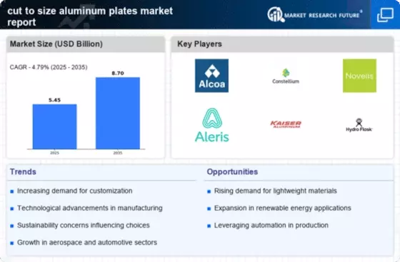 The cut to size aluminum plates market is characterized by a dynamic competitive landscape, driven by increasing demand across various sectors such as automotive, aerospace, and construction. Key players are actively engaging in strategies that emphasize innovation, sustainability, and operational efficiency. For instance, Alcoa (US) has been focusing on enhancing its production capabilities through advanced manufacturing technologies, while Novelis (US) is prioritizing sustainability initiatives, aiming to increase its recycled aluminum content in products. These strategic orientations not only bolster their market positions but also contribute to a more competitive environment where innovation and sustainability are paramount.In terms of business tactics, companies are increasingly localizing manufacturing to reduce lead times and optimize supply chains. This approach appears to be particularly effective in a moderately fragmented market, where the collective influence of key players shapes pricing strategies and product offerings. The competitive structure is evolving, with larger firms leveraging economies of scale while smaller players focus on niche markets and specialized products, creating a diverse landscape.