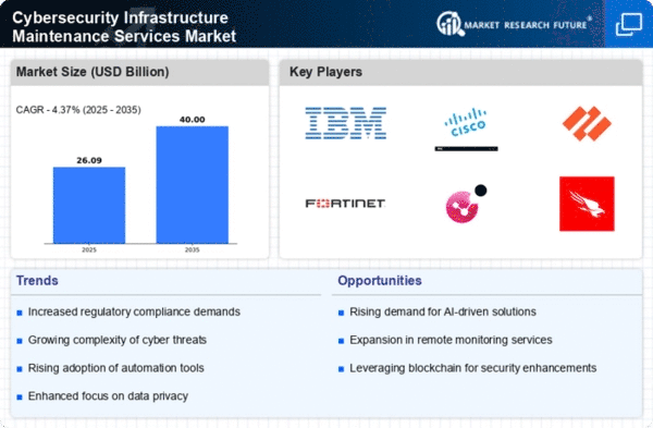 The Cybersecurity Infrastructure Maintenance Services Market is characterized by a dynamic competitive landscape, driven by the increasing demand for robust security solutions amid rising cyber threats. Key players such as IBM (US), Cisco Systems (US), and Palo Alto Networks (US) are strategically positioned to leverage their technological expertise and extensive service portfolios. IBM (US) focuses on integrating AI and machine learning into its cybersecurity offerings, enhancing threat detection and response capabilities. Cisco Systems (US) emphasizes partnerships with cloud service providers to expand its reach and improve service delivery, while Palo Alto Networks (US) is investing heavily in R&D to innovate its security solutions, particularly in the realm of cloud security. Collectively, these strategies foster a competitive environment that prioritizes innovation and adaptability.The market structure appears moderately fragmented, with numerous players vying for market share. Key business tactics include localizing service offerings to meet regional compliance requirements and optimizing supply chains to enhance service delivery efficiency. The influence of major players is significant, as their strategic initiatives often set industry standards and drive technological advancements.