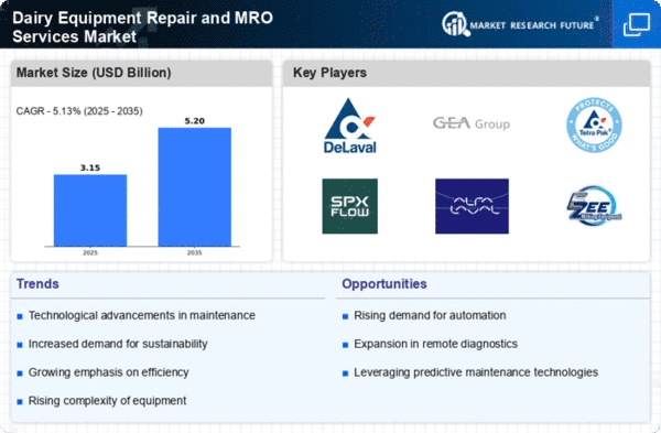 The Middle East and Africa region, with a market size of 0.1, is at a nascent stage in the Dairy Equipment Repair and MRO Services Market. The growth is hindered by limited infrastructure, varying regulatory standards, and a lack of awareness regarding maintenance services. However, there is a growing demand for dairy products, which presents opportunities for market expansion. Governments are beginning to recognize the importance of the dairy sector, leading to potential regulatory support in the future.