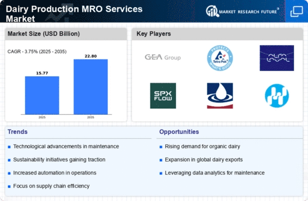 The Dairy Production MRO Services Market is characterized by a competitive landscape that is increasingly shaped by innovation, sustainability, and digital transformation. Key players such as GEA Group (DE), Tetra Pak (SE), and Alfa Laval (SE) are at the forefront, leveraging their technological expertise to enhance operational efficiencies and product offerings. GEA Group (DE) focuses on automation and process optimization, while Tetra Pak (SE) emphasizes sustainable packaging solutions. Alfa Laval (SE) is known for its heat transfer and separation technologies, which are critical in dairy processing. Collectively, these strategies not only enhance their market positioning but also contribute to a more competitive environment that prioritizes efficiency and sustainability.In terms of business tactics, companies are increasingly localizing manufacturing to reduce lead times and optimize supply chains. The market appears moderately fragmented, with several players vying for market share, yet the influence of major companies remains substantial. This competitive structure allows for a dynamic interplay between established firms and emerging players, fostering innovation and responsiveness to market demands.
