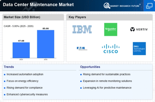 The Data Center Maintenance Market is significantly influenced by the need for compliance with various regulatory standards. Organizations are increasingly required to adhere to stringent regulations regarding data protection, environmental sustainability, and operational efficiency. For instance, regulations such as GDPR and ISO standards necessitate regular audits and maintenance of data centers to ensure compliance. This compliance-driven approach compels organizations to invest in maintenance services that align with these regulations, thereby fostering growth in the Data Center Maintenance Market. As regulatory frameworks evolve, the demand for maintenance services that ensure compliance is expected to increase, presenting a lucrative opportunity for industry players.