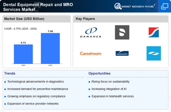 Europe's Dental Equipment Repair and MRO Services Market is valued at 1.5B, reflecting a growing demand for maintenance and repair services. Factors such as an aging population, increased dental awareness, and advancements in dental technology are driving this growth. Regulatory frameworks across the EU are becoming more stringent, promoting higher standards for dental equipment, which in turn boosts the demand for reliable repair services and maintenance solutions.