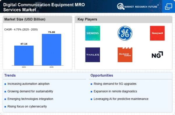 The Digital Communication Equipment MRO Services Market is characterized by a dynamic competitive landscape, driven by rapid technological advancements and increasing demand for reliable communication systems across various sectors. Key players such as Siemens (DE), General Electric (US), and Honeywell (US) are strategically positioned to leverage their extensive expertise in engineering and technology. Siemens (DE) focuses on digital transformation initiatives, enhancing operational efficiency through innovative solutions. General Electric (US) emphasizes partnerships and collaborations to expand its service offerings, while Honeywell (US) invests in sustainability and smart technologies, indicating a collective shift towards more integrated and environmentally conscious service models.The market structure appears moderately fragmented, with a mix of established players and emerging companies vying for market share. Key business tactics include localizing manufacturing to reduce lead times and optimize supply chains, which is crucial in maintaining competitive advantage. The influence of major players is significant, as their strategic decisions often set industry standards and drive innovation, thereby shaping the overall market dynamics.