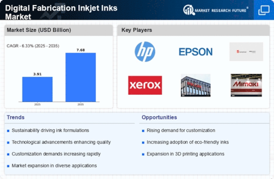Customization and personalization are becoming increasingly vital in the Digital Fabrication Inkjet Inks Market. As consumers seek unique and tailored products, businesses are responding by offering customizable printing solutions. This trend is particularly evident in sectors such as packaging, textiles, and promotional materials, where personalized designs can significantly enhance brand appeal. The ability to produce short runs of customized products without compromising quality is driving demand for advanced inkjet inks that can accommodate varied specifications. Market data suggests that the personalization segment is expected to grow at a rate of approximately 8% annually, reflecting the importance of customization in maintaining competitive advantage. Companies that leverage this trend may find new opportunities for growth within the Digital Fabrication Inkjet Inks Market.