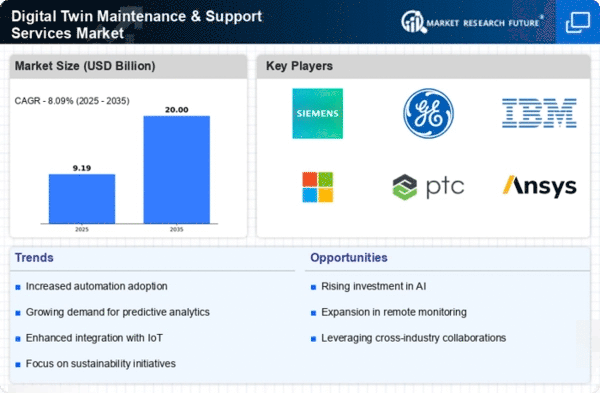 The Digital Twin Maintenance & Support Services Market is currently characterized by a dynamic competitive landscape, driven by rapid technological advancements and increasing demand for operational efficiency across various industries. Key players such as Siemens (DE), General Electric (US), and IBM (US) are strategically positioning themselves through innovation and partnerships. Siemens (DE) has focused on enhancing its digital twin capabilities, particularly in manufacturing and smart infrastructure, while General Electric (US) emphasizes its expertise in industrial applications, leveraging its extensive experience in the energy sector. IBM (US) is concentrating on integrating AI and machine learning into its digital twin solutions, thereby enhancing predictive maintenance capabilities. Collectively, these strategies not only bolster their market presence but also shape a competitive environment that prioritizes technological integration and customer-centric solutions.In terms of business tactics, companies are increasingly localizing their operations to better serve regional markets and optimize supply chains. The market structure appears moderately fragmented, with several players vying for dominance. However, the influence of major companies is substantial, as they set benchmarks for innovation and service delivery. This competitive structure encourages smaller firms to adopt niche strategies or seek partnerships to enhance their offerings, thereby contributing to a more diverse market landscape.