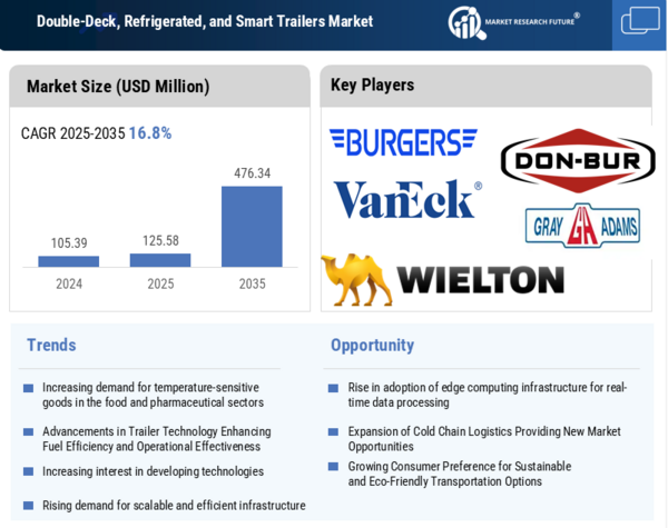 The South American double-deck, refrigerated, and smart trailers market has already started growing with the rising cold-chain logistics need, growth in organized retail, and increasing movement of temperature-sensitive goods across long-distance corridors. The region’s logistics sector is beset by a set of challenges-expansive geographies, uneven infrastructure quality, and elevated operating costs-which are driving fleet operators to consider double-deck trailer configurations that can maximize payload efficiency and reduce cost per trip. Food distribution, e-commerce, and parcel logistics are some areas where demand remains strong, as higher load density directly improves profitability and asset utilization.