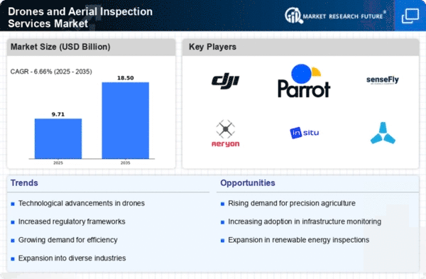 The Drones and Aerial Inspection Services Market is currently characterized by a dynamic competitive landscape, driven by technological advancements and increasing demand for efficient inspection solutions across various sectors. Key players such as DJI (CN), Parrot (FR), and Insitu (US) are at the forefront, each adopting distinct strategies to enhance their market positioning. DJI (CN) continues to lead with a focus on innovation, particularly in developing advanced imaging technologies and AI capabilities, which are crucial for aerial inspections. Meanwhile, Parrot (FR) emphasizes partnerships with local firms to expand its reach in Europe, thereby enhancing its operational footprint. Insitu (US), a subsidiary of Boeing, is leveraging its aerospace expertise to integrate drones into broader defense and commercial applications, indicating a strategic pivot towards diversified service offerings.The market structure appears moderately fragmented, with numerous players vying for market share. Key business tactics include localizing manufacturing to reduce costs and optimize supply chains, which is particularly relevant in the context of rising global logistics challenges. The collective influence of these major companies shapes a competitive environment where innovation and operational efficiency are paramount, allowing them to respond swiftly to market demands.