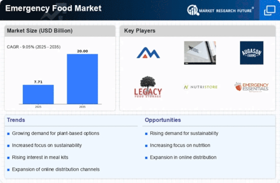 Government initiatives aimed at disaster preparedness and response are likely to bolster the Emergency Food Market. Various agencies are implementing programs that encourage citizens to stockpile emergency supplies, including food. For instance, the Federal Emergency Management Agency (FEMA) promotes preparedness through campaigns that educate the public on the importance of having emergency food on hand. This support may lead to increased funding and resources for emergency food programs, thereby enhancing the overall market landscape. As governments continue to prioritize disaster readiness, the Emergency Food Market could experience growth driven by public awareness and policy support.