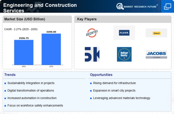 Europe's Engineering and Construction Services market is valued at 700.0, reflecting a steady growth trajectory. Key drivers include increased public spending on infrastructure, a shift towards sustainable construction practices, and the European Union's regulatory frameworks promoting green initiatives. The demand for energy-efficient buildings and smart city projects is also on the rise, supported by government incentives and funding programs aimed at enhancing urban infrastructure and connectivity. Leading countries in this region include Germany, France, and the UK, where major firms like Skanska and Balfour Beatty are actively involved in large-scale projects. The competitive landscape is marked by a mix of local and international players, fostering innovation and collaboration. The European market is increasingly focusing on digital transformation, with companies adopting advanced technologies such as Building Information Modeling (BIM) to improve project outcomes and efficiency. "The construction sector is pivotal for achieving the EU's climate goals," states the European Commission.