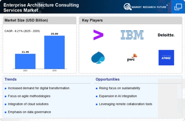The Enterprise Architecture Consulting Services Market is currently characterized by a dynamic competitive landscape, driven by the increasing demand for digital transformation and the need for organizations to streamline their operations. Key players such as Accenture (IE), IBM (US), and Deloitte (US) are strategically positioned to leverage their extensive expertise in technology and consulting services. Accenture (IE) focuses on innovation and partnerships, particularly in cloud services and AI integration, which enhances its competitive edge. IBM (US) emphasizes its capabilities in hybrid cloud solutions and AI, aiming to provide comprehensive enterprise architecture frameworks. Deloitte (US) is known for its strong consulting practices, particularly in risk management and compliance, which are critical in today’s regulatory environment. Collectively, these strategies shape a competitive environment that is increasingly focused on technological advancement and client-centric solutions.The market structure appears moderately fragmented, with a mix of large multinational firms and specialized boutique consultancies. Key players employ various business tactics, such as localizing services to meet regional demands and optimizing supply chains to enhance efficiency. This competitive structure allows for a diverse range of offerings, enabling clients to select services that best fit their unique needs. The influence of major players is significant, as they set industry standards and drive innovation through their extensive resources and expertise.