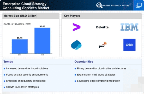 The Enterprise Cloud Strategy Consulting Services Market is characterized by a dynamic competitive landscape, driven by the increasing demand for digital transformation and cloud adoption across various sectors. Major players such as Accenture (IE), Deloitte (US), and IBM (US) are strategically positioned to leverage their extensive expertise in technology and consulting services. Accenture (IE) focuses on innovation and partnerships, particularly in enhancing cloud capabilities through collaborations with leading technology providers. Deloitte (US) emphasizes its comprehensive service offerings, integrating cloud strategy with risk management and compliance, thereby appealing to a diverse clientele. Meanwhile, IBM (US) is concentrating on artificial intelligence (AI) integration within its cloud services, aiming to provide advanced analytics and automation solutions that enhance operational efficiency. Collectively, these strategies contribute to a competitive environment that is increasingly centered around technological advancement and client-centric solutions.The market's competitive structure appears moderately fragmented, with a mix of large multinational firms and specialized consultancies. Key players are employing various business tactics, such as localizing services to meet regional demands and optimizing supply chains to enhance service delivery. This fragmentation allows for a diverse range of offerings, yet the influence of major players remains substantial, as they set industry standards and drive innovation.
