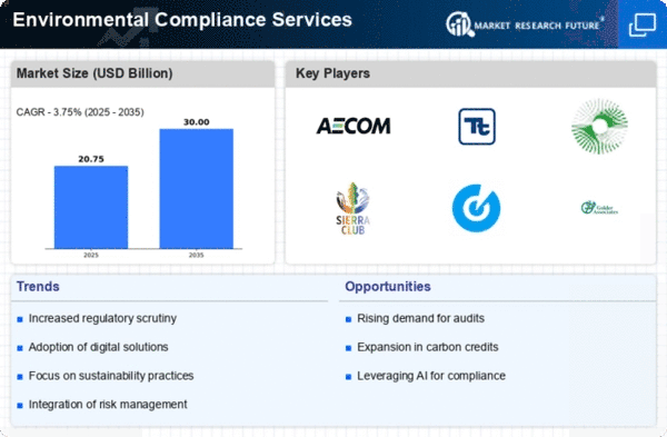The Environmental Compliance Services market is characterized by a dynamic competitive landscape, driven by increasing regulatory pressures and a growing emphasis on sustainability. Key players are actively positioning themselves through innovation, strategic partnerships, and regional expansions. For instance, AECOM (US) has focused on enhancing its digital capabilities to streamline compliance processes, while Tetra Tech (US) emphasizes its expertise in water management and environmental restoration. These strategies collectively shape a competitive environment that is increasingly focused on technological advancement and sustainability initiatives.The market structure appears moderately fragmented, with several key players exerting influence across various segments. Companies are adopting tactics such as localizing services to meet regional compliance requirements and optimizing supply chains to enhance efficiency. This fragmentation allows for a diverse range of service offerings, yet the collective influence of major players like ERM (GB) and WSP Global (CA) is significant, as they leverage their global reach to establish best practices and drive industry standards.