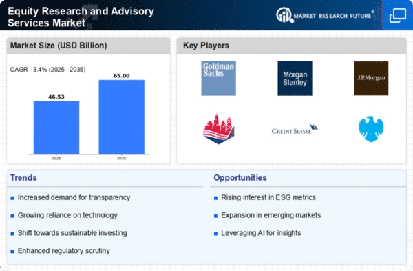 The Equity Research and Advisory Services Market is characterized by a dynamic competitive landscape, driven by factors such as technological advancements, regulatory changes, and evolving client needs. Major players like Goldman Sachs (US), Morgan Stanley (US), and J.P. Morgan (US) are at the forefront, each adopting distinct strategies to enhance their market positioning. Goldman Sachs (US) emphasizes innovation through its digital platforms, aiming to streamline client interactions and improve data analytics capabilities. Meanwhile, Morgan Stanley (US) focuses on expanding its advisory services, particularly in sustainable investments, reflecting a growing trend towards ESG (Environmental, Social, and Governance) criteria. J.P. Morgan (US) has been actively pursuing strategic partnerships to bolster its research capabilities, thereby enhancing its competitive edge in a crowded marketplace.The market structure appears moderately fragmented, with a mix of established firms and emerging players vying for market share. Key business tactics include localizing services to meet regional demands and optimizing supply chains to enhance efficiency. The collective influence of these major players shapes the competitive environment, as they leverage their resources to adapt to changing market conditions and client expectations.