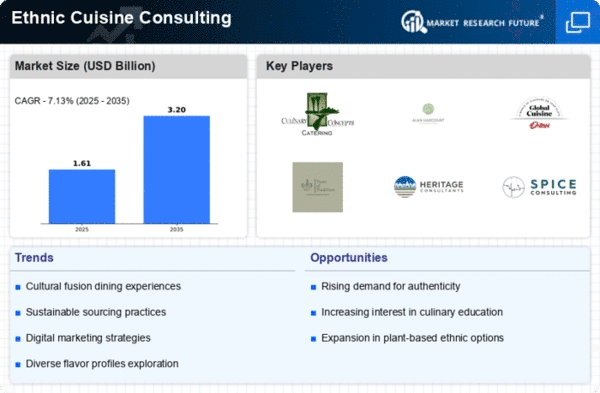 The Ethnic Cuisine Consulting market is characterized by a dynamic competitive landscape, driven by increasing consumer interest in diverse culinary experiences and the globalization of food culture. Key players such as Culinary Concepts, Ethnic Flavors Consulting (US), and Global Cuisine Advisors (US) are strategically positioned to capitalize on these trends. Culinary Concepts (US) focuses on innovation through the development of unique culinary experiences that blend traditional recipes with modern techniques, thereby appealing to a broad demographic. Ethnic Flavors Consulting (US) emphasizes regional expansion, having recently opened new offices in Europe to cater to the growing demand for authentic ethnic cuisine. Meanwhile, Global Cuisine Advisors (US) is leveraging digital transformation to enhance its consulting services, utilizing data analytics to provide tailored solutions for clients.The business tactics employed by these companies include localizing their offerings to meet regional tastes and optimizing supply chains to ensure the authenticity of ingredients. The market appears moderately fragmented, with a mix of established firms and emerging players. This fragmentation allows for a diverse range of consulting services, although the collective influence of key players is significant in shaping industry standards and practices.
