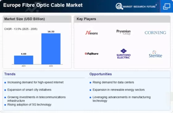 The integration of emerging technologies is significantly influencing the Europe Fibre Optic Cable Market. As industries increasingly adopt technologies such as 5G, Internet of Things (IoT), and smart city initiatives, the demand for robust and high-capacity fibre optic networks is expected to rise. In 2026, it is projected that the deployment of 5G networks will require extensive fibre optic infrastructure to support the high data rates and low latency that these technologies demand. Additionally, IoT applications, which rely on real-time data transmission, are likely to drive further investments in fibre optics. The convergence of these technologies with fibre optics not only enhances network performance but also opens new avenues for innovation and service delivery across various sectors, including healthcare, transportation, and manufacturing.