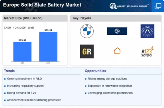 The increasing demand for electric vehicles (EVs) in Europe is a primary driver for the Europe Solid State Battery Market. As governments across the region implement stringent emissions regulations and provide incentives for EV adoption, the need for advanced battery technologies becomes paramount. Solid state batteries, known for their higher energy density and safety compared to traditional lithium-ion batteries, are gaining traction among automakers. In 2025, the European EV market is projected to reach over 3 million units sold, further emphasizing the necessity for innovative battery solutions. This trend indicates a robust growth trajectory for the Europe Solid State Battery Market, as manufacturers seek to enhance vehicle performance and range.