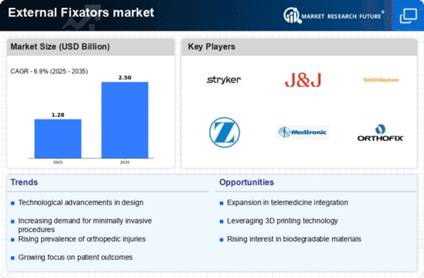 The external fixators Market is characterized by a dynamic competitive landscape, driven by technological advancements, increasing demand for orthopedic procedures, and a growing emphasis on minimally invasive surgical techniques. Key players such as Stryker Corporation (US), DePuy Synthes (US), and Smith & Nephew (GB) are at the forefront, each adopting distinct strategies to enhance their market positioning. Stryker Corporation (US) focuses on innovation, particularly in developing advanced fixation systems that integrate digital technologies, while DePuy Synthes (US) emphasizes strategic partnerships to expand its product offerings and market reach. Smith & Nephew (GB) is actively pursuing regional expansion, particularly in emerging markets, to capitalize on the rising demand for orthopedic solutions. Collectively, these strategies contribute to a competitive environment that is increasingly shaped by technological innovation and strategic collaborations.In terms of business tactics, companies are localizing manufacturing to reduce costs and enhance supply chain efficiency. This approach is particularly relevant in a moderately fragmented market where several players vie for market share. The competitive structure is influenced by the collective actions of these key players, who are increasingly focused on optimizing their supply chains and enhancing product availability to meet the growing demand for external fixators.