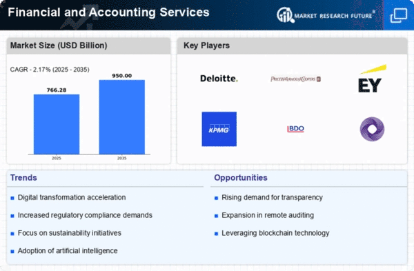 The Financial and Accounting Services. is characterized by a dynamic competitive landscape, driven by technological advancements, regulatory changes, and evolving client expectations. Major players such as Deloitte (US), PricewaterhouseCoopers (US), and Ernst & Young (US) are at the forefront, each adopting distinct strategies to enhance their market positioning. Deloitte (US) emphasizes innovation through its investment in artificial intelligence and data analytics, aiming to streamline client operations and improve decision-making processes. Meanwhile, PricewaterhouseCoopers (US) focuses on expanding its global footprint, particularly in emerging markets, thereby diversifying its service offerings and client base. Ernst & Young (US) is increasingly prioritizing sustainability, integrating environmental considerations into its advisory services, which reflects a broader industry trend towards responsible business practices. Collectively, these strategies contribute to a competitive environment that is both collaborative and competitive, as firms seek to differentiate themselves while also forming strategic alliances to enhance service delivery.The business tactics employed within this market are multifaceted, with firms increasingly localizing their services to better meet regional client needs. This localization, coupled with supply chain optimization, allows companies to respond swiftly to market demands. The competitive structure of the Financial and Accounting Services. appears moderately fragmented, with a mix of large multinational firms and smaller regional players. The influence of key players is substantial, as they set industry standards and drive innovation, thereby shaping the overall market dynamics.