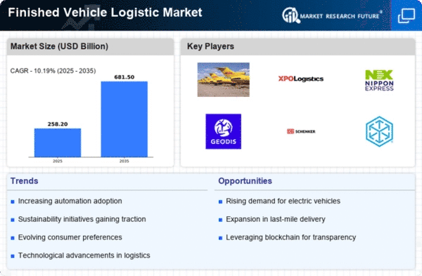The Finished Vehicle Logistic Market is characterized by a dynamic competitive landscape, driven by factors such as increasing vehicle production, the rise of e-commerce, and the growing demand for efficient supply chain solutions. Key players like DHL Supply Chain (DE), Kuehne + Nagel (CH), and XPO Logistics (US) are strategically positioned to leverage these trends. DHL Supply Chain (DE) focuses on digital transformation and sustainability initiatives, aiming to enhance operational efficiency and reduce carbon footprints. Kuehne + Nagel (CH) emphasizes innovation through technology integration, particularly in automating logistics processes. XPO Logistics (US) is enhancing its service offerings through strategic partnerships and acquisitions, thereby strengthening its market presence and operational capabilities.The market structure appears moderately fragmented, with several players competing for market share. Key business tactics include localizing manufacturing and optimizing supply chains to meet regional demands. The collective influence of these major companies shapes the competitive environment, as they adopt advanced technologies and innovative practices to differentiate themselves from competitors.