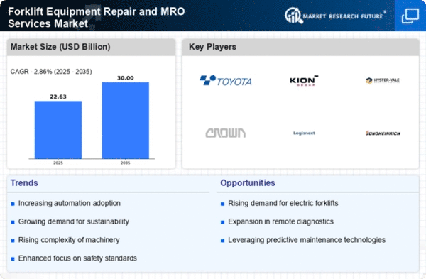 The rapid growth of the e-commerce and logistics sector is a key driver for the Forklift Equipment Repair and MRO Services Market. As online shopping continues to gain traction, warehouses and distribution centers are expanding their operations to meet consumer demands. This expansion necessitates a robust fleet of forklifts to handle increased inventory and streamline operations. Market data indicates that the logistics sector is expected to grow by over 7% annually, further fueling the need for reliable forklift equipment. Consequently, the demand for repair and maintenance services is likely to rise, as businesses seek to ensure their equipment remains operational and efficient. The Forklift Equipment Repair and MRO Services Market stands to benefit significantly from this trend, as companies prioritize equipment reliability to maintain competitive advantage.