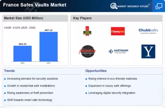 The France Safes Vaults Market is experiencing a notable transformation due to rapid technological advancements. Innovations such as biometric locks, smart safes, and remote monitoring systems are becoming increasingly prevalent. These technologies not only enhance security but also provide users with greater convenience and control over their valuables. For instance, the integration of mobile applications allows users to monitor their safes in real-time, which is particularly appealing to tech-savvy consumers. As a result, the demand for high-tech safes is likely to rise, potentially leading to a market growth rate of approximately 5% annually over the next few years. This trend indicates a shift towards more sophisticated security solutions within the France Safes Vaults Market.