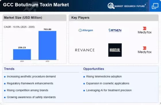 The regulatory landscape surrounding the GCC Botulinum Toxin Market is evolving, which may have significant implications for market growth. Governments in the region are increasingly focusing on establishing stringent guidelines and regulations to ensure the safety and efficacy of botulinum toxin products. This regulatory scrutiny is likely to enhance consumer confidence and promote the responsible use of these products. For instance, the introduction of new approval processes for botulinum toxin formulations may streamline market entry for innovative products. Furthermore, regulatory bodies are emphasizing the importance of training and certification for practitioners, which could improve treatment outcomes. As a result, the GCC Botulinum Toxin Market may benefit from a more structured environment that fosters growth while ensuring patient safety.
