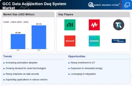 The GCC Data Acquisition Daq System Market is significantly influenced by the growth of industrial automation across various sectors. Industries such as manufacturing, energy, and transportation are increasingly adopting automated processes to enhance efficiency and productivity. Data acquisition systems are integral to these automated environments, providing critical data for monitoring and control. The GCC region has seen substantial investments in automation technologies, particularly in the oil and gas sector, which is expected to continue driving demand for data acquisition systems. This trend suggests a robust market outlook as industries seek to optimize operations through automation.