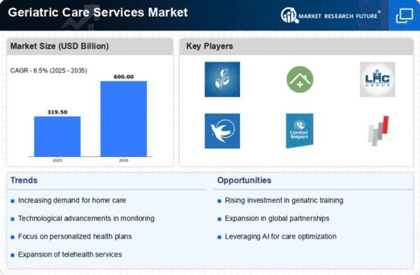 The Geriatric Care Services Market is currently characterized by a dynamic competitive landscape, driven by an increasing aging population and a growing demand for personalized care solutions. Key players such as Brookdale Senior Living (US), Amedisys (US), and Visiting Angels (US) are strategically positioning themselves through various operational focuses, including digital transformation and regional expansion. These companies are not only enhancing their service offerings but also adapting to the evolving needs of their clientele, thereby shaping a competitive environment that emphasizes quality and accessibility.In terms of business tactics, companies are increasingly localizing their services to better cater to community-specific needs, which appears to be a response to the diverse preferences of the elderly population. The market structure is moderately fragmented, with a mix of large and small players, allowing for a variety of service models. The collective influence of these key players is significant, as they drive innovation and set benchmarks for service quality across the sector.
