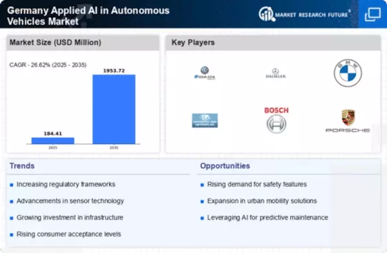 The Germany Applied Ai In Autonomous Vehicles Market benefits from robust regulatory frameworks that encourage innovation. The German government has established clear guidelines for the testing and deployment of autonomous vehicles, which fosters a conducive environment for technological advancements. For instance, the Federal Ministry for Economic Affairs and Energy has initiated programs to support research and development in AI applications for transportation. This regulatory backing not only enhances safety standards but also accelerates the integration of AI technologies in vehicles. As a result, companies are more likely to invest in AI-driven solutions, knowing that they operate within a supportive legal framework. The market is projected to grow significantly, with estimates suggesting a compound annual growth rate of over 20% in the coming years, driven by these favorable policies.