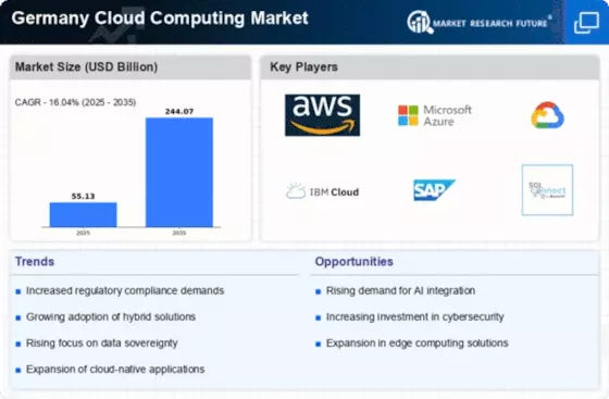 The Germany Cloud Computing Market is experiencing a notable surge in demand driven by the ongoing digital transformation across various sectors. Organizations are increasingly adopting cloud solutions to enhance operational efficiency, reduce costs, and improve customer experiences. According to recent data, approximately 70 percent of German enterprises have initiated digital transformation projects, with cloud computing being a pivotal component. This trend is likely to continue as businesses seek to leverage advanced technologies such as artificial intelligence and big data analytics, which are often more effectively deployed in cloud environments. The shift towards digitalization not only fosters innovation but also positions companies to remain competitive in an evolving market landscape. As a result, the demand for cloud services is expected to grow, further solidifying the role of the Germany Cloud Computing Market in the broader economic framework.
