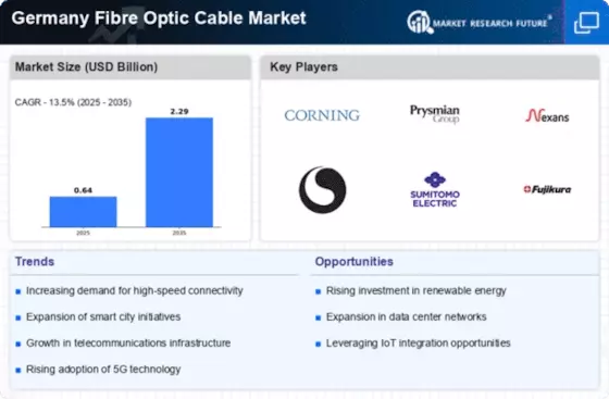 The German government actively promotes the expansion of the fibre optic infrastructure through various initiatives. The Digital Strategy 2025 aims to ensure that all households have access to high-speed internet, which is crucial for the Germany Fibre Optic Cable Market. This initiative includes substantial funding for the development of fibre optic networks, with an investment of approximately 12 billion euros allocated to enhance digital infrastructure. Furthermore, the government has set ambitious targets to achieve nationwide coverage by 2025, which is expected to drive demand for fibre optic cables significantly. The regulatory framework is also being streamlined to facilitate faster deployment of fibre networks, thereby creating a conducive environment for growth in the Germany Fibre Optic Cable Market.