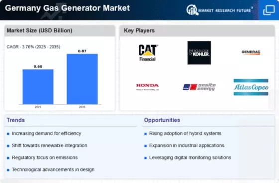 The Germany Gas Generator Market is experiencing a notable shift towards enhanced energy efficiency due to technological advancements. Innovations in generator design and materials have led to the development of more efficient gas generators, which consume less fuel while delivering higher output. For instance, the integration of smart technologies allows for real-time monitoring and optimization of generator performance. This trend is supported by Germany's commitment to reducing carbon emissions, aligning with the European Union's climate goals. As a result, the market is projected to grow at a compound annual growth rate (CAGR) of approximately 4.5% over the next five years, driven by the demand for energy-efficient solutions.